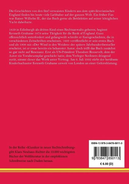 In der Reihe »Klassiker in neuer Rechtschreibung« gibt Klara Neuhaus-Richter die wichtigsten Bücher der Weltliteratur in der empfohlenen Schreibweise nach Duden heraus. Kenneth Grahame: Das goldene Zeitalter. Erinnerungen an die Kindheit Die Geschichten von den fünf verwaisten Kindern aus dem spätviktorianischen England finden bis heute viele Liebhaber auf der ganzen Welt. Ein früher Fan war Kaiser Wilhelm II., der das Buch gerne als Bettlektüre auf seiner königlichen Yacht dabeihatte. »The Golden Age«. Erstdruck: London, The Bodley Head, 1895. Hier in der Übersetzung von Emmy Becher, Stuttgart, Engelhorn, 1900 in der Reihe »Engelhorns Allgemeine Romanbibliothek. Eine Auswahl der besten modernen Romane aller Völker«, 16. Jahrgang, Band 23. Neu herausgegeben von Klara Neuhaus-Richter, Berlin 2021. Umschlaggestaltung von Rainer Richter unter Verwendung einer Porträtzeichnung von Josefine Weinschrott. Gesetzt aus der Minion Pro, 11 pt. Henricus - Edition Deutsche Klassik GmbH Über den Autor: 1859 in Edinburgh als drittes Kind eines Rechtsanwalts geboren, beginnt Kenneth Grahame 1879 seine Tätigkeit für die Bank of England. Ganz offensichtlich unterfordert und gelangweilt schreibt er Kurzgeschichten, die in verschiedenen Zeitschriften erscheinen. 1893 veröffentlicht er sein erstes Buch und als 1908 mit »Der Wind in den Weiden« der spätere Jahrhundertbestseller erscheint, ist er zwar bereits ein bekannter Autor, doch trifft das Buch zunächst so gar nicht auf Resonanz. Erst als US-Präsident Theodore Roosevelt, dem der Autor ein Vorabexemplar geschickt hatte, dem Verleger Scribners dringend zurät, nimmt dieser das Werk unter Vertrag. Am 6. Juli 1932 stirbt der berühmte Kinderbuchautor Kenneth Grahame unweit von London an einer Gehirnblutung.