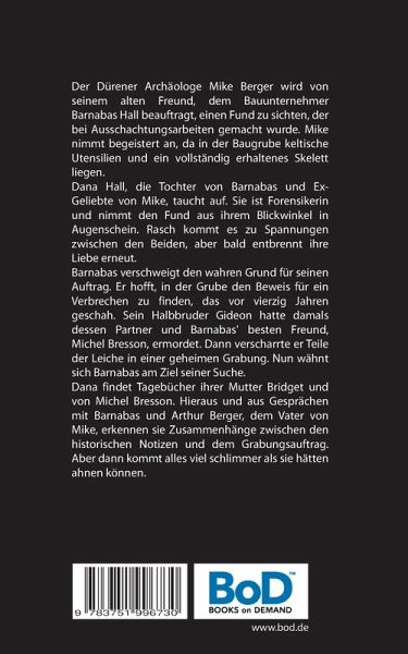 Der Dürener Archäologe Mike Berger wird von seinem alten Freund, dem Bauunternehmer Barnabas Hall beauftragt, einen Fund zu sichten, der bei Ausschachtungsarbeiten gemacht wurde. Mike nimmt begeistert an, da in der Baugrube keltische Utensilien und ein vollständig erhaltenes Skelett liegen.Dana Hall, die Tochter von Barnabas und Ex-Geliebte von Mike, taucht auf. Sie ist Forensikerin und nimmt den Fund aus ihrem Blickwinkel in Augenschein. Rasch kommt es zu Spannungen zwischen den Beiden, aber bald entbrennt ihre Liebe erneut.Barnabas verschweigt den wahren Grund für seinen Auftrag. Er hofft, in der Grube den Beweis für ein Verbrechen zu finden, das vor vierzig Jahren geschah. Sein Halbbruder Gideon hatte damals dessen Partner und Barnabas' besten Freund, Michel Bresson, ermordet. Dann verscharrte er Teile der Leiche in einer geheimen Grabung. Nun wähnt sich Barnabas am Ziel seiner Suche.Dana findet Tagebücher ihrer Mutter Bridget und von Michel Bresson. Hieraus und aus Gesprächenmit Barnabas und Arthur Berger, dem Vater von Mike, erkennen sie Zusammenhänge zwischen den historischen Notizen und dem Grabungsauftrag. Aber dann kommt alles viel schlimmer als sie hätten ahnen können.