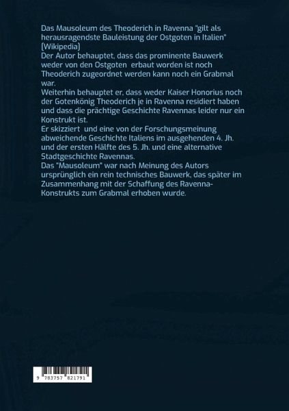 Das Mausoleum des Theoderich in Ravenna "gilt als herausragendste Bauleistung der Ostgoten in Italien" [Wikipedia]Der Autor behauptet, dass das prominente Bauwerk weder von den Ostgoten erbaut worden ist noch Theoderich zugeordnet werden kann noch ein Grabmal war.Weiterhin behauptet er, dass weder Kaiser Honorius noch der Gotenkönig Theoderich je in Ravenna residiert haben und dass die prächtige Geschichte Ravennas leider nur ein Konstrukt ist.Er skizziert und eine von der Forschungsmeinung abweichende Geschichte Italiens im ausgehenden 4. Jh. und der ersten Hälfte des 5. Jh. und eine alternative Stadtgeschichte Ravennas.Das "Mausoleum" war nach Meinung des Autors ursprünglich ein rein technisches Bauwerk, das später im Zusammenhang mit der Schaffung des Ravenna-Konstrukts zum Grabmal erhoben wurde.