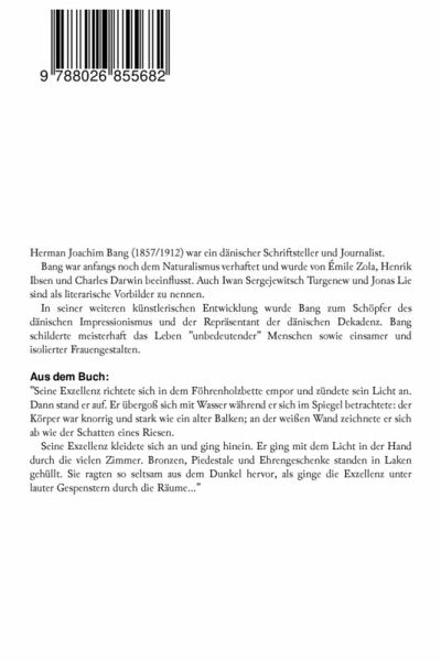 Herman Joachim Bang (1857/1912) war ein dänischer Schriftsteller und Journalist. Bang war anfangs noch dem Naturalismus verhaftet und wurde von Émile Zola, Henrik Ibsen und Charles Darwin beeinflusst. Auch Iwan Sergejewitsch Turgenew und Jonas Lie sind als literarische Vorbilder zu nennen. In seiner weiteren künstlerischen Entwicklung wurde Bang zum Schöpfer des dänischen Impressionismus und der Repräsentant der dänischen Dekadenz. Bang schilderte meisterhaft das Leben "unbedeutender" Menschen sowie einsamer und isolierter Frauengestalten. Aus dem Buch: "Seine Exzellenz richtete sich in dem Föhrenholzbette empor und zündete sein Licht an. Dann stand er auf. Er übergoß sich mit Wasser während er sich im Spiegel betrachtete: der Körper war knorrig und stark wie ein alter Balken; an der weißen Wand zeichnete er sich ab wie der Schatten eines Riesen. Seine Exzellenz kleidete sich an und ging hinein. Er ging mit dem Licht in der Hand durch die vielen Zimmer. Bronzen, Piedestale und Ehrengeschenke standen in Laken gehüllt. Sie ragten so seltsam aus dem Dunkel hervor, als ginge die Exzellenz unter lauter Gespenstern durch die Räume..."