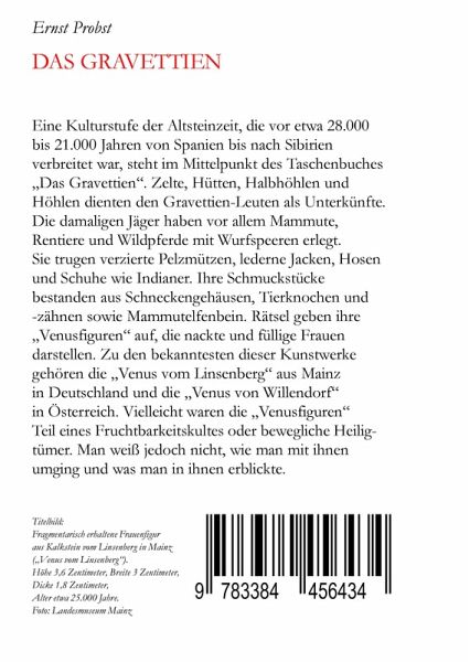 Eine Kulturstufe der Altsteinzeit, die vor etwa 35.000 bis 24.000 Jahren von Spanien bis nach Sibirien verbreitet war, steht im Mittelpunkt des E-Books "Das Gravettien". Zelte, Hütten, Halbhöhlen und Höhlen dienten den Gravettien-Leuten als Unterkünfte. Die damaligen Jäger haben vor allem Mammute, Rentiere und Wildpferde mit Wurfspeeren erlegt. Sie trugen verzierte Pelzmützen, lederne Jacken, Hosen und Schuhe wie Indianer. Ihre Schmuckstücke bestanden aus Schneckengehäusen, Tierknochen und -zähnen sowie Mammutelfenbein. Rätsel geben ihre "Venusfiguren" auf, die nackte und füllige Frauen darstellen. Zu den bekanntesten dieser Kunstwerke gehören die "Venus vom Linsenberg" aus Mainz in Deutschland und die "Venus von Willendorf" in Österreich. Vielleicht waren die "Venusfiguren" Teil eines Fruchtbarkeitskultes oder bewegliche Heiligtümer. Man weiß jedoch nicht, wie man mit ihnen umging und was man in ihnen erblickte.