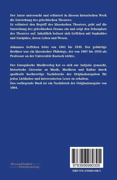 Er erläutert den Begriff des klassischen Theaters, geht auf die Entstehung des griechischen Drama ein und zeigt den Schauplatz des Theaters auf. Inhaltlich befasst sich Geffcken mit Sophokles und Euripides, deren Leben und Wesen.