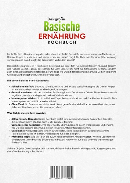 Fühlst Du Dich oft müde, energielos oder schläfst schlecht? Suchst Du nach einer einfachen Methode, um Deinen Körper zu entlasten und dabei lecker zu essen? Fragst Du Dich, wie Du einer Übersäuerung vorbeugen und damit langfristig Krankheiten verhindern kannst?Dann ist dieses große 3-in-1-Kochbuch, bestehend aus den Titeln "Genussvoll Basisch", "Gesund Basisch" und "Schnell Basisch", genau das Richtige für Dich! Es bietet Dir nicht nur 450 köstliche Rezepte, sondern auch einen umfangreichen Ratgeber, der Dir zeigt, wie Du mit der basischen Ernährung Deinen Körper ins Gleichgewicht bringst und Krankheiten vorbeugst.Die Vorteile dieses 3-in-1-Kochbuchs:- Schnell und einfach: Entdecke schnelle, einfache und leckere basische Rezepte, die Deinen Körper im Handumdrehen wieder ins Gleichgewicht bringen.- Gesund abnehmen: Mit der basischen Ernährung kannst Du nicht nur Deinen Säure-Basen-Haushalt regulieren, sondern auch gesund und natürlich abnehmen.- Immunsystem stärken: Schütze DeinenKörper besser vor Infekten und Krankheiten, indem Du Dein Immunsystem auf natürliche Weise stärkst.- Ohne Verzicht: Du musst auf nichts verzichten - genieße eine Vielzahl an leckeren Gerichten, ohne dabei auf Geschmack oder Genuss zu verzichten.Was Dich in diesem Buch erwartet:- 450 raffinierte Rezepte: Dieses Kochbuch bietet Dir eine beeindruckende Auswahl an Rezepten, die nicht nur lecker, sondern auch leicht zuzubereiten sind.- Umfangreicher Ratgeber: Lerne alles, was Du über Säuren und Basen wissen musst, und erfahre, wie Du eine basische Ernährung einfach in Deinen Alltag integrieren kannst.- Unkomplizierte Küche: Keine langen Zutatenlisten, keine komplizierten Zubereitungsschritte - die basische Küche ist einfach, vielseitig und für jeden geeignet.- Praktische Tipps: Wie lässt sich die 80/20-Regel einfach im Alltag umsetzen? Welche Lebensmittel unterstützen Deine basische Ernährung am besten? Antworten auf diese und viele weitere Fragen findest Du hier.Sichere Dir jetzt Dein Exemplar und starte noch heute Deine Reise in eine gesunde, ausgewogene und säurefreie Ernährung voller Genuss!