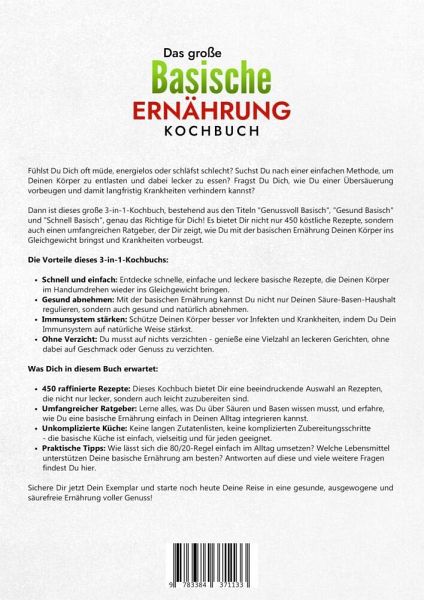 Fühlst Du Dich oft müde, energielos oder schläfst schlecht? Suchst Du nach einer einfachen Methode, um Deinen Körper zu entlasten und dabei lecker zu essen? Fragst Du Dich, wie Du einer Übersäuerung vorbeugen und damit langfristig Krankheiten verhindern kannst?Dann ist dieses große 3-in-1-Kochbuch, bestehend aus den Titeln "Genussvoll Basisch", "Gesund Basisch" und "Schnell Basisch", genau das Richtige für Dich! Es bietet Dir nicht nur 450 köstliche Rezepte, sondern auch einen umfangreichen Ratgeber, der Dir zeigt, wie Du mit der basischen Ernährung Deinen Körper ins Gleichgewicht bringst und Krankheiten vorbeugst.Die Vorteile dieses 3-in-1-Kochbuchs:- Schnell und einfach: Entdecke schnelle, einfache und leckere basische Rezepte, die Deinen Körper im Handumdrehen wieder ins Gleichgewicht bringen.- Gesund abnehmen: Mit der basischen Ernährung kannst Du nicht nur Deinen Säure-Basen-Haushalt regulieren, sondern auch gesund und natürlich abnehmen.- Immunsystem stärken: Schütze DeinenKörper besser vor Infekten und Krankheiten, indem Du Dein Immunsystem auf natürliche Weise stärkst.- Ohne Verzicht: Du musst auf nichts verzichten - genieße eine Vielzahl an leckeren Gerichten, ohne dabei auf Geschmack oder Genuss zu verzichten.Was Dich in diesem Buch erwartet:- 450 raffinierte Rezepte: Dieses Kochbuch bietet Dir eine beeindruckende Auswahl an Rezepten, die nicht nur lecker, sondern auch leicht zuzubereiten sind.- Umfangreicher Ratgeber: Lerne alles, was Du über Säuren und Basen wissen musst, und erfahre, wie Du eine basische Ernährung einfach in Deinen Alltag integrieren kannst.- Unkomplizierte Küche: Keine langen Zutatenlisten, keine komplizierten Zubereitungsschritte - die basische Küche ist einfach, vielseitig und für jeden geeignet.- Praktische Tipps: Wie lässt sich die 80/20-Regel einfach im Alltag umsetzen? Welche Lebensmittel unterstützen Deine basische Ernährung am besten? Antworten auf diese und viele weitere Fragen findest Du hier.Sichere Dir jetzt Dein Exemplar und starte noch heute Deine Reise in eine gesunde, ausgewogene und säurefreie Ernährung voller Genuss!