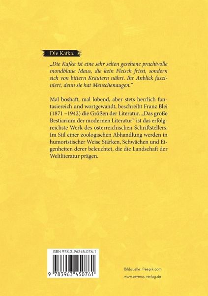 "Die Kafka. Die Kafka ist eine sehr selten gesehene prachtvolle mondblaue Maus, die kein Fleisch frisst, sondern sich von bittern Kräutern nährt. Ihr Anblick fasziniert, denn sie hat Menschenaugen."Mal boshaft, mal lobend, aber stets herrlich fantasiereich und wortgewandt beschreibt Franz Blei (1871 -1942) die Größen der Literatur. "Das große Bestiarium der modernen Literatur" ist das erfolgreichste Werk des österreichischen Schriftstellers. Im Stil einer zoologischen Abhandlung werden in humoristischer Weise Stärken, Schwächen und Eigenheiten derer beleuchtet, die die Landschaft der Weltliteratur prägen.