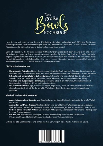 Hast Du Lust auf gesunde und leckere Mahlzeiten, die schnell zubereitet sind? Möchtest Du Deinen Körper optimal mit Nährstoffen versorgen, ohne auf Geschmack zu verzichten? Suchst Du nach kreativen Rezeptideen, die sich problemlos in Deinen Alltag integrieren lassen?Dann ist dieses Bowl-Kochbuch genau das Richtige für Dich! Dieses Buch zeigt Dir, wie leicht und schnell Du leckere und gesunde Bowls zubereiten kannst - perfekt für jeden Tag. Egal, ob Du süße, herzhafte, vegane, vegetarische oder Bowls mit Fisch und Fleisch bevorzugst, hier findest Du die passenden Ideen für jede Gelegenheit. Jede Schüssel ist nicht nur ein echter Hingucker, sondern versorgt Dich auch mit allen wichtigen Nähr- und Vitalstoffen, die Dein Körper braucht.Die Vorteile dieses Buches:- Umfassender Ratgeber: Neben den Rezepten bietet das Buch wertvolle Tipps und Anleitungen, wie Du Bowls nach Deinen individuellen Bedürfnissen zusammenstellst und die besten Zutaten auswählst.- Schnelle und unkomplizierte Zubereitung: Alle Rezepte sind so gestaltet, dass Du ohne viel Aufwand eine nahrhafte und leckere Bowl zaubern kannst - ideal für den hektischen Alltag.- Gesunde und ausgewogene Ernährung: Jede Bowl ist reich an Vitaminen, Mineralstoffen und Ballaststoffen, die Deinen Körper optimal unterstützen.- Für jeden Geschmack: Egal, ob Du Dich vegan, vegetarisch, Low Carb oder proteinreich ernährst - dieses Rezeptbuch bietet Dir die perfekte Vielfalt, um Deine Ernährung abwechslungsreich zu gestalten.Was Dich in diesem Buch erwartet:- Abwechslungsreiche Rezepte: Von Buddha Bowls bis Smoothie Bowls - entdecke die große Vielfalt der Bowls.- Antworten auf Deine Fragen: Wie kreiert man eine perfekte Bowl? Was macht Bowls so gesund? Welche Zutaten passen besonders gut zusammen? All diese Fragen werden ausführlich beantwortet.- Leckere Bowls für jeden Anlass: Ob Frühstück, Mittagessen, Abendessen oder Snacks - Bowls passen in jeden Ernährungsplan.- Gesund und lecker: Bowls versorgen Dich mit vielen wichtigen Vitaminen, sekundären Pflanzenstoffen und Ballaststoffen und sind dabei farbenfroh und köstlich.Sichere Dir jetzt Dein Exemplar und bringe frischen Schwung in Deine Küche mit leckeren Bowls!