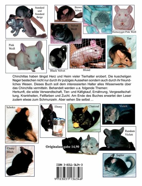 Chinchillas haben längst Herz und Heim vieler Tierhalter erobert. Die kuscheligen Nager bestechen nicht nur durch ihr putziges Aussehen sondern auch durch ihr freundliches Wesen. Dieses Buch soll dem interessierten Halter alles Wissenswerte über das Chinchilla vermitteln. Behandelt werden u.a. folgende Themen:Herkunft, die wilde Verwandtschaft, Tier- und Käfigkauf, Ernährung, Vergesellschaftung, Krankheiten, Fellfarben, Zucht. Am Ende des Buches erwartet den Leser zudem etwas zum Schmunzeln ...