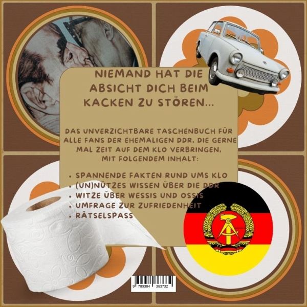 "Es hat niemand die Absicht dich beim Kacken zu stören!"Lassen wir uns nun die Wahrheit eingestehen: Jeder von uns muss es tun, doch selten wird darüber gesprochen - der Toilettenbesuch!Entdecke daher das perfekte Begleitbuch für jeden Fan der ehemaligen DDR! Das ideale Geschenk an dich selbst oder an andere."Das große DDR Klobuch" ist randvoll mit humorvollen Anekdoten, kniffligen Rätseln, lustigen Witzen, entspannenden Mandalas und Ausmalbildern sowie interessanten Informationen rund um die ehemalige Deutsche Demokratische Republik.Ein absolutes Muss für das stille Örtchen! Der ultimative Zeitvertreib für alle Fans der ehemaligen DDR.