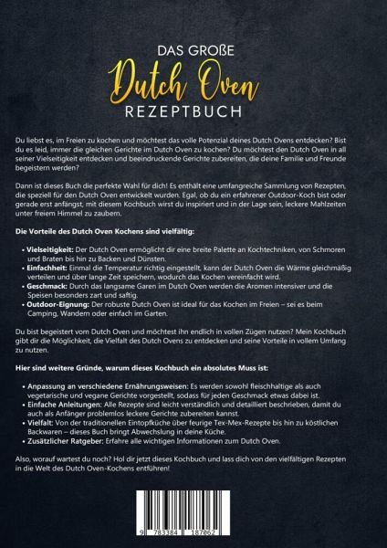 Du liebst es, im Freien zu kochen und möchtest das volle Potenzial deines Dutch Ovens entdecken? Bist du es leid, immer die gleichen Gerichte im Dutch Oven zu kochen? Du möchtest den Dutch Oven in all seiner Vielseitigkeit entdecken und beeindruckende Gerichte zubereiten, die deine Familie und Freunde begeistern werden?Dann ist dieses Buch die perfekte Wahl für dich! Es enthält eine umfangreiche Sammlung von Rezepten, die speziell für den Dutch Oven entwickelt wurden. Egal, ob du ein erfahrener Outdoor-Koch bist oder gerade erst anfängst, mit diesem Kochbuch wirst du inspiriert und in der Lage sein, leckere Mahlzeiten unter freiem Himmel zu zaubern.Die Vorteile des Dutch Oven Kochens sind vielfältig:- Vielseitigkeit: Der Dutch Oven ermöglicht dir eine breite Palette an Kochtechniken, von Schmoren und Braten bis hin zu Backen und Dünsten.- Einfachheit: Einmal die Temperatur richtig eingestellt, kann der Dutch Oven die Wärme gleichmäßig verteilen und über lange Zeit speichern, wodurch das Kochen vereinfacht wird.- Geschmack: Durch das langsame Garen im Dutch Oven werden die Aromen intensiver und die Speisen besonders zart und saftig.- Outdoor-Eignung: Der robuste Dutch Oven ist ideal für das Kochen im Freien - sei es beim Camping, Wandern oder einfach im Garten.Du bist begeistert vom Dutch Oven und möchtest ihn endlich in vollen Zügen nutzen? Mein Kochbuch gibt dir die Möglichkeit, die Vielfalt des Dutch Ovens zu entdecken und seine Vorteile in vollem Umfang zu nutzen.Hier sind weitere Gründe, warum dieses Kochbuch ein absolutes Muss ist:- Anpassung an verschiedene Ernährungsweisen: Es werden sowohl fleischhaltige als auch vegetarische und vegane Gerichte vorgestellt, sodass für jeden Geschmack etwas dabei ist.- Einfache Anleitungen: Alle Rezepte sind leicht verständlich und detailliert beschrieben, damit du auch als Anfänger problemlos leckere Gerichte zubereiten kannst.- Vielfalt: Von der traditionellen Eintopfküche über feurige Tex-Mex-Rezepte bis hin zuköstlichen Backwaren - dieses Buch bringt Abwechslung in deine Küche.- Zusätzlicher Ratgeber: Erfahre alle wichtigen Informationen zum Dutch Oven.Also, worauf wartest du noch? Hol dir jetzt dieses Kochbuch und lass dich von den vielfältigen Rezepten in die Welt des Dutch Oven-Kochens entführen!