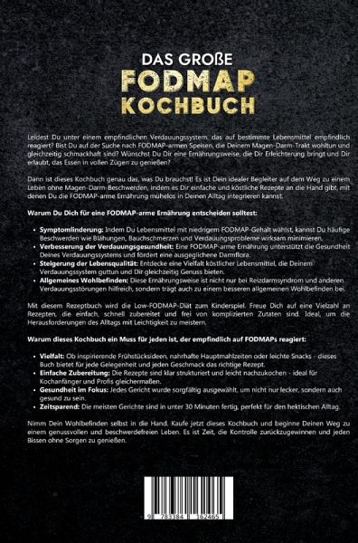Leidest Du unter einem empfindlichen Verdauungssystem, das auf bestimmte Lebensmittel empfindlich reagiert? Bist Du auf der Suche nach FODMAP-armen Speisen, die Deinem Magen-Darm-Trakt wohltun und gleichzeitig schmackhaft sind? Wünschst Du Dir eine Ernährungsweise, die Dir Erleichterung bringt und Dir erlaubt, das Essen in vollen Zügen zu genießen?Dann ist dieses Kochbuch genau das, was Du brauchst! Es ist Dein idealer Begleiter auf dem Weg zu einem Leben ohne Magen-Darm-Beschwerden, indem es Dir einfache und köstliche Rezepte an die Hand gibt, mit denen Du die FODMAP-arme Ernährung mühelos in Deinen Alltag integrieren kannst.Warum Du Dich für eine FODMAP-arme Ernährung entscheiden solltest:- Symptomlinderung: Indem Du Lebensmittel mit niedrigem FODMAP-Gehalt wählst, kannst Du häufige Beschwerden wie Blähungen, Bauchschmerzen und Verdauungsprobleme wirksam minimieren.- Verbesserung der Verdauungsgesundheit: Eine FODMAP-arme Ernährung unterstützt die Gesundheit Deines Verdauungssystems und fördert eine ausgeglichene Darmflora.- Steigerung der Lebensqualität: Entdecke eine Vielfalt köstlicher Lebensmittel, die Deinem Verdauungssystem guttun und Dir gleichzeitig Genuss bieten.- Allgemeines Wohlbefinden: Diese Ernährungsweise ist nicht nur bei Reizdarmsyndrom und anderen Verdauungsstörungen hilfreich, sondern trägt auch zu einem besseren allgemeinen Wohlbefinden bei.Mit diesem Rezeptbuch wird die Low-FODMAP-Diät zum Kinderspiel. Freue Dich auf eine Vielzahl an Rezepten, die einfach, schnell zubereitet und frei von komplizierten Zutaten sind. Ideal, um die Herausforderungen des Alltags mit Leichtigkeit zu meistern.Warum dieses Kochbuch ein Muss für jeden ist, der empfindlich auf FODMAPs reagiert:- Vielfalt: Ob inspirierende Frühstücksideen, nahrhafte Hauptmahlzeiten oder leichte Snacks - dieses Buch bietet für jede Gelegenheit und jeden Geschmack das richtige Rezept.- Einfache Zubereitung: Die Rezepte sind klar strukturiert und leicht nachzukochen - ideal für Kochanfänger und Profis gleichermaßen.- Gesundheit im Fokus: Jedes Gericht wurde sorgfältig ausgewählt, um nicht nur lecker, sondern auch gesund zu sein.- Zeitsparend: Die meisten Gerichte sind in unter 30 Minuten fertig, perfekt für den hektischen Alltag.Nimm Dein Wohlbefinden selbst in die Hand. Kaufe jetzt dieses Kochbuch und beginne Deinen Weg zu einem genussvollen und beschwerdefreien Leben. Es ist Zeit, die Kontrolle zurückzugewinnen und jeden Bissen ohne Sorgen zu genießen.