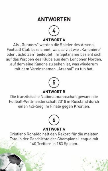 In welcher Stadt steht das größte Fußballstadion Europas? Welche englische Mannschaft wird auch als "Gunners" bezeichnet? Wer hält den Rekord für die meisten Tore in der Champions League? Mit diesem handlichen Quiz-Block kannst du dein Fußballwissen auf die Probe stellen und zum echten Quiz-Champion werden!