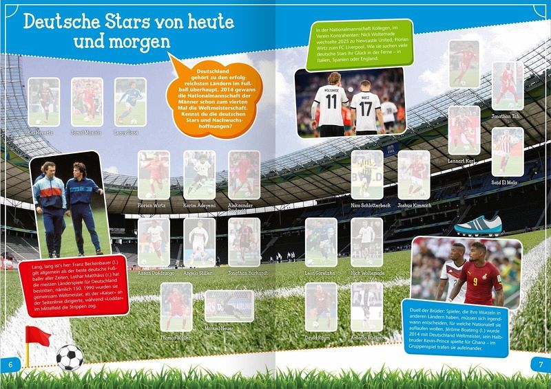 Ein Stickerheft mit vielen Fotos und Infos zu aktuellen Spielerinnen und Spielern, Trainern und Stars aus der Vergangenheit - von Mbappé, Kimmich und Gwinn bis zu Pelé!