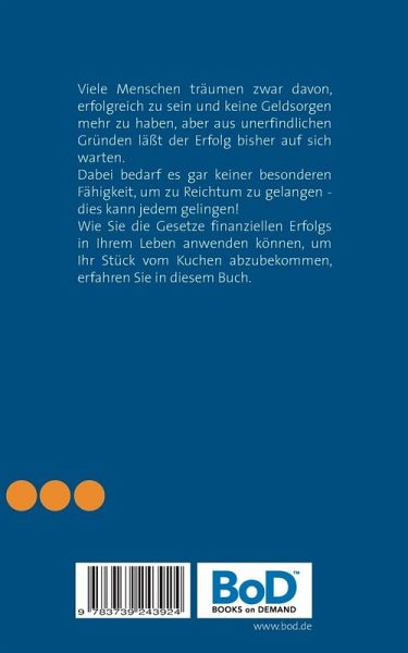 Viele Menschen träumen zwar davon, erfolgreich zu sein und keine Geldsorgen mehr zu haben, aber aus unerfindlichen Gründen lässt der Erfolg bisher auf sich warten.Dabei bedarf es gar keiner besonderen Fähigkeit, um zu Reichtum zu gelangen - dies kann jedem gelingen!Wie Sie die Gesetze finanziellen Erfolgs in Ihrem Leben anwenden können, um Ihr Stück vom Kuchen abzubekommen, erfahren Sie in diesem Buch.