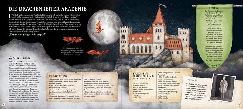 Nur 13 Schüler_innen werden jedes Jahr an der Academia Solomonaria aufgenommen, der weltweit einzigen Drachenreiter-Akademie. Wer die Aufnahmeprüfung bestehen will, muss seinen Mut zusammennehmen und sein Können unter Beweis stellen. Und das dafür unerlässliche Wissen steht in diesem Buch: Anatomie, Flügel, Lebenszyklen, Verhalten, Jagdtechniken, Balz, Feuer sowie die Geheimnisse des Drachenflugs. Und natürlich alles über die unterschiedlichen Drachenarten und ihre Lebensräume.