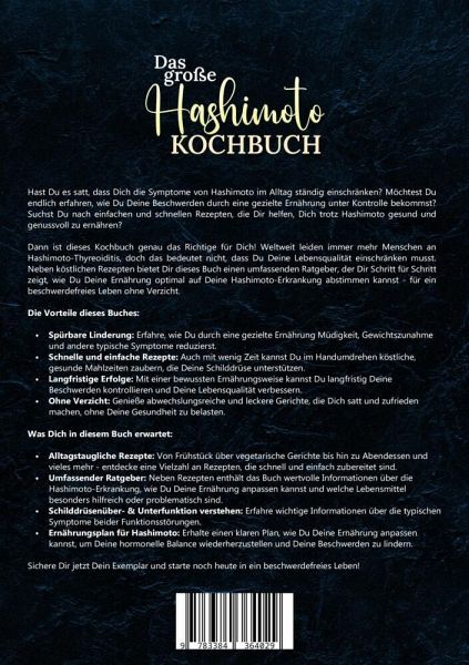 Hast Du es satt, dass Dich die Symptome von Hashimoto im Alltag ständig einschränken? Möchtest Du endlich erfahren, wie Du Deine Beschwerden durch eine gezielte Ernährung unter Kontrolle bekommst? Suchst Du nach einfachen und schnellen Rezepten, die Dir helfen, Dich trotz Hashimoto gesund und genussvoll zu ernähren?Dann ist dieses Kochbuch genau das Richtige für Dich! Weltweit leiden immer mehr Menschen an Hashimoto-Thyreoiditis, doch das bedeutet nicht, dass Du Deine Lebensqualität einschränken musst. Neben köstlichen Rezepten bietet Dir dieses Buch einen umfassenden Ratgeber, der Dir Schritt für Schritt zeigt, wie Du Deine Ernährung optimal auf Deine Hashimoto-Erkrankung abstimmen kannst - für ein beschwerdefreies Leben ohne Verzicht.Die Vorteile dieses Buches:- Spürbare Linderung: Erfahre, wie Du durch eine gezielte Ernährung Müdigkeit, Gewichtszunahme und andere typische Symptome reduzierst.- Schnelle und einfache Rezepte: Auch mit wenig Zeit kannst Du im Handumdrehen köstliche, gesunde Mahlzeiten zaubern, die Deine Schilddrüse unterstützen.- Langfristige Erfolge: Mit einer bewussten Ernährungsweise kannst Du langfristig Deine Beschwerden kontrollieren und Deine Lebensqualität verbessern.- Ohne Verzicht: Genieße abwechslungsreiche und leckere Gerichte, die Dich satt und zufrieden machen, ohne Deine Gesundheit zu belasten.Was Dich in diesem Buch erwartet:- Alltagstaugliche Rezepte: Von Frühstück über vegetarische Gerichte bis hin zu Abendessen und vieles mehr - entdecke eine Vielzahl an Rezepten, die schnell und einfach zubereitet sind.- Umfassender Ratgeber: Neben Rezepten enthält das Buch wertvolle Informationen über die Hashimoto-Erkrankung, wie Du Deine Ernährung anpassen kannst und welche Lebensmittel besonders hilfreich oder problematisch sind.- Schilddrüsenüber- & Unterfunktion verstehen: Erfahre wichtige Informationen über die typischen Symptome beider Funktionsstörungen.- Ernährungsplan für Hashimoto: Erhalte einen klaren Plan, wie Du Deine Ernährung anpassen kannst, um Deine hormonelle Balance wiederherzustellen und Deine Beschwerden zu lindern.Sichere Dir jetzt Dein Exemplar und starte noch heute in ein beschwerdefreies Leben!