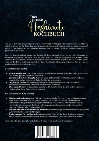 Hast Du es satt, dass Dich die Symptome von Hashimoto im Alltag ständig einschränken? Möchtest Du endlich erfahren, wie Du Deine Beschwerden durch eine gezielte Ernährung unter Kontrolle bekommst? Suchst Du nach einfachen und schnellen Rezepten, die Dir helfen, Dich trotz Hashimoto gesund und genussvoll zu ernähren?Dann ist dieses Kochbuch genau das Richtige für Dich! Weltweit leiden immer mehr Menschen an Hashimoto-Thyreoiditis, doch das bedeutet nicht, dass Du Deine Lebensqualität einschränken musst. Neben köstlichen Rezepten bietet Dir dieses Buch einen umfassenden Ratgeber, der Dir Schritt für Schritt zeigt, wie Du Deine Ernährung optimal auf Deine Hashimoto-Erkrankung abstimmen kannst - für ein beschwerdefreies Leben ohne Verzicht.Die Vorteile dieses Buches:- Spürbare Linderung: Erfahre, wie Du durch eine gezielte Ernährung Müdigkeit, Gewichtszunahme und andere typische Symptome reduzierst.- Schnelle und einfache Rezepte: Auch mit wenig Zeit kannst Du im Handumdrehen köstliche, gesunde Mahlzeiten zaubern, die Deine Schilddrüse unterstützen.- Langfristige Erfolge: Mit einer bewussten Ernährungsweise kannst Du langfristig Deine Beschwerden kontrollieren und Deine Lebensqualität verbessern.- Ohne Verzicht: Genieße abwechslungsreiche und leckere Gerichte, die Dich satt und zufrieden machen, ohne Deine Gesundheit zu belasten.Was Dich in diesem Buch erwartet:- Alltagstaugliche Rezepte: Von Frühstück über vegetarische Gerichte bis hin zu Abendessen und vieles mehr - entdecke eine Vielzahl an Rezepten, die schnell und einfach zubereitet sind.- Umfassender Ratgeber: Neben Rezepten enthält das Buch wertvolle Informationen über die Hashimoto-Erkrankung, wie Du Deine Ernährung anpassen kannst und welche Lebensmittel besonders hilfreich oder problematisch sind.- Schilddrüsenüber- & Unterfunktion verstehen: Erfahre wichtige Informationen über die typischen Symptome beider Funktionsstörungen.- Ernährungsplan für Hashimoto: Erhalte einen klaren Plan, wie Du Deine Ernährung anpassen kannst, um Deine hormonelle Balance wiederherzustellen und Deine Beschwerden zu lindern.Sichere Dir jetzt Dein Exemplar und starte noch heute in ein beschwerdefreies Leben!