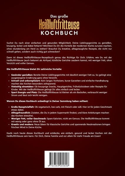 Suchst Du nach einer einfachen und gesunden Möglichkeit, Deine Lieblingsgerichte zu genießen, knusprig, lecker und dabei fettarm? Möchtest Du Dir die Vorteile der modernen Küche zunutze machen, ohne stundenlang am Herd zu stehen? Brauchst Du kreative, alltagstaugliche Rezepte, die nicht nur schnell gehen, sondern auch richtig gut schmecken?Dann ist dieses Heißluftfritteuse-Rezeptbuch genau das Richtige für Dich. Erfahre, wie Du mit der Heißluftfritteuse (auch bekannt als Airfryer) köstliche Gerichte zaubern kannst, mit weniger Fett, ohne Verzicht und voller Genuss.Die Heißluftfritteuse bietet Dir zahlreiche Vorteile:- Gesünder genießen: Bereite Deine Lieblingsgerichte mit deutlich weniger Fett zu. So gelingt eine ausgewogene Ernährung ganz ohne Verzicht.- Schnell und unkompliziert: Kein langes Vorheizen, kurze Garzeiten und einfache Handhabung machen das Kochen besonders zeitsparend.- Vielseitig einsetzbar: Ob knusprige Snacks, Hauptgerichte, Frühstücksideen oder Rezepte für Kinder. Mit der Heißluftfritteuse gelingt Dir alles einfach und lecker.- Spart Energie und Platz: Die Heißluftfritteuse ist kleiner als ein Backofen, verbraucht weniger Strom und lässt sich leicht reinigen.Warum Du dieses Kochbuch unbedingt in Deiner Sammlung haben solltest:- Große Rezeptvielfalt: Ob vegetarisch, low carb, mit Fleisch oder süß. Hier ist für jeden Geschmack etwas dabei.- Alltagsfreundlich: Zutaten, die Du in jedem Supermarkt findest, und klare Anleitungen machen das Kochen stressfrei.- Weniger Fett, voller Geschmack: Spare Kalorien, nicht am Genuss. Die Heißluftfritteuse kommt mit wenig oder ganz ohne Öl aus.- Kreativ und modern: Neue Ideen für klassische Gerichte und spannende Neukreationen bringen frischen Wind in Deine Küche.Kaufe noch heute dieses Kochbuch und entdecke, wie einfach, gesund und lecker Kochen mit der Heißluftfritteuse sein kann. Für Dich, Deine Familie und vor allem für mehr Freude am Essen!