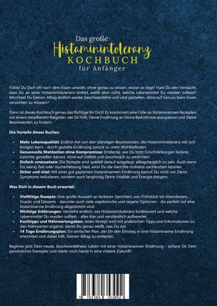 Fühlst Du Dich oft nach dem Essen unwohl, ohne genau zu wissen, woran es liegt? Hast Du den Verdacht, dass Du an einer Histaminintoleranz leidest, weißt aber nicht, welche Lebensmittel Du meiden solltest? Möchtest Du Deinen Alltag endlich wieder beschwerdefrei und vital gestalten, ohne auf Genuss beim Essen verzichten zu müssen?Dann ist dieses Kochbuch genau das Richtige für Dich! Es kombiniert eine Fülle an histaminarmen Rezepten mit einem detaillierten Ratgeber, der Dir hilft, Deine Ernährung an Deine Bedürfnisse anzupassen und Deine Beschwerden zu lindern.Die Vorteile dieses Buches:- Mehr Lebensqualität: Endlich frei von den ständigen Beschwerden, die Histaminintoleranz mit sich bringen kann - durch gezielte Ernährung zurück zu mehr Wohlbefinden.- Genussvolle Mahlzeiten ohne Kompromisse: Entdecke, wie Du trotz Einschränkungen leckere Gerichte genießen kannst, ohne auf Vielfalt und Geschmack zu verzichten.- Einfach umzusetzen: Die Rezepte sind speziell darauf ausgelegt, alltagstauglich zu sein. Auch wenn Du wenig Zeit oder Kocherfahrung hast, wirst Du die Gerichte mühelos nachkochen können.- Sicher und vital: Mit einer gut geplanten histaminarmen Ernährung kannst Du nicht nur Deine Symptome reduzieren, sondern auch langfristig Deine Vitalität und Energie steigern.Was Dich in diesem Buch erwartet:- Vielfältige Rezepte: Eine große Auswahl an leckeren Gerichten, von Frühstück bis Abendessen, Snacks und Desserts - darunter auch viele vegetarische und vegane Optionen - die perfekt auf eine histaminarme Ernährung abgestimmt sind.- Wichtige Erklärungen: Verstehe endlich, wie Histaminintoleranz funktioniert und welche Lebensmittel Du meiden solltest - alles klar und verständlich aufbereitet.- Kochtipps und Nährwertangaben: Jedes Rezept wird mit praktischen Tipps und Informationen zu den Nährwerten ergänzt, damit Du genau weißt, was Du isst.- 14 Tage Ernährungsplan: Ein einfacher Plan, der Dir den Einstieg in eine histaminarme Ernährung erleichtert und dabei hilft, Deinen Alltag zu entlasten.Beginne jetzt Dein neues, beschwerdefreies Leben mit einer histaminarmen Ernährung - sichere Dir Dein persönliches Exemplar und starte noch heute in eine vitalere Zukunft!