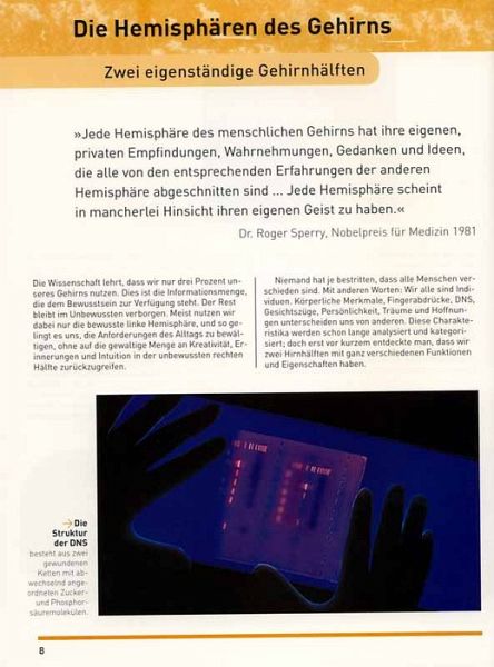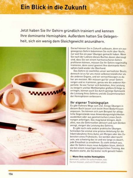 Das große IQ-Trainingsprogramm enthält sorgfältig ausgearbeitete Tests, mit denen Sie herausfinden können, ob ihre rechte oder linke Hirnhälfte dominiert. Sobald Sie das wissen, können Sie mit den Übungen in diesem Buch die andere Hemisphäre trainieren und Ihr Potential voll nutzen. Sie erfahren, was die beiden Hirnhälften leisten, wie sie die Personlichkeit und Intelligenz beeinflussen und alltägliche Probleme lösen Erkenn Sie Ihre Stärken und Schwächen, und erkunden Sie, wie ihr Gehirn arbeitet und was Sie trainieren müssen: die räumliche Vorstellung, das Gedächtnis, den Umgang mit Zahlen, die Logik, die Kreativität oder das laterale Denken. Nutzen Sie Ihr neues Wissen, um am Arbeitsplatz und zu Hause noch mehr zu leisten. Erfinden Sie selbst einfache Rätsel, die Ihren speziellen Bedürfnissen entsprechen, und stellen Sie aus den illustrierten Übungen in diesem Buch Ihr persönliches Programm zusammmen, das Ihr Gehirn ins Gleichgewicht bringt.