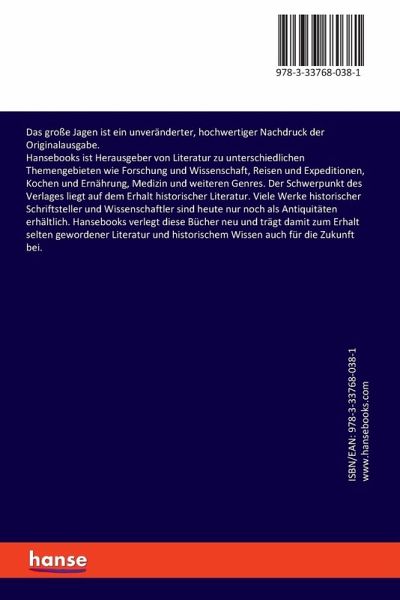 Das große Jagen ist ein unveränderter, hochwertiger Nachdruck der Originalausgabe.Hansebooks ist Herausgeber von Literatur zu unterschiedlichen Themengebieten wie Forschung und Wissenschaft, Reisen und Expeditionen, Kochen und Ernährung, Medizin und weiteren Genres. Der Schwerpunkt des Verlages liegt auf dem Erhalt historischer Literatur. Viele Werke historischer Schriftsteller und Wissenschaftler sind heute nur noch als Antiquitäten erhältlich. Hansebooks verlegt diese Bücher neu und trägt damit zum Erhalt selten gewordener Literatur und historischem Wissen auch für die Zukunft bei.