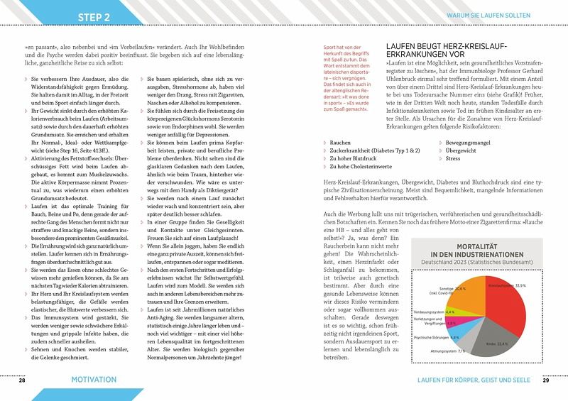 Ergänzt wird das Buch durch Motivationstipps, Ratschläge wie man typische Läuferverletzungen vermeiden und behandeln kann, Hinweise zur richtigen Wettkämpfer-Ernährung und Tipps zum Abnehmen durch Laufen.
