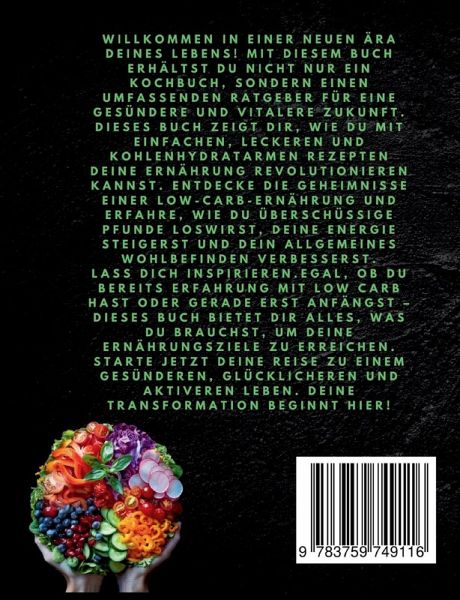 Tauchen Sie ein in die faszinierende Welt der Low-Carb-Ernährung und entdecken Sie die Geheimnisse eines gesunden Lebensstils! Unser Buch bietet Ihnen nicht nur eine Vielzahl köstlicher und kreativer Rezepte, sondern auch fundierte Informationen darüber, wie Sie Ihre Ernährung umstellen können, um Ihre Gesundheit zu verbessern.Mit einfachen und dennoch raffinierten Rezepten decken wir eine breite Palette von Gerichten ab, von herzhaften Hauptgerichten bis hin zu verlockenden Desserts. Ob Sie sich für ein knuspriges Low-Carb-Brot, saftige Gemüseaufläufe oder erfrischende Salate entscheiden - unsere Rezepte zeigen Ihnen, dass Low-Carb-Ernährung keineswegs langweilig sein muss!Unsere Buchbeschreibung bietet nicht nur praktische Anleitungen und leckere Rezepte, sondern auch wertvolle Tipps und Tricks, wie Sie Ihren Low-Carb-Lebensstil erfolgreich umsetzen können. Mit klaren Anweisungen, verständlichen Erklärungen und inspirierenden Fotos ist dieses Buch ein unverzichtbarer Begleiter für alle, die ihre Gesundheit und ihr Wohlbefinden verbessern möchten. Werden Sie Teil der Low-Carb-Bewegung und starten Sie noch heute Ihre Reise zu einem gesünderen Leben!