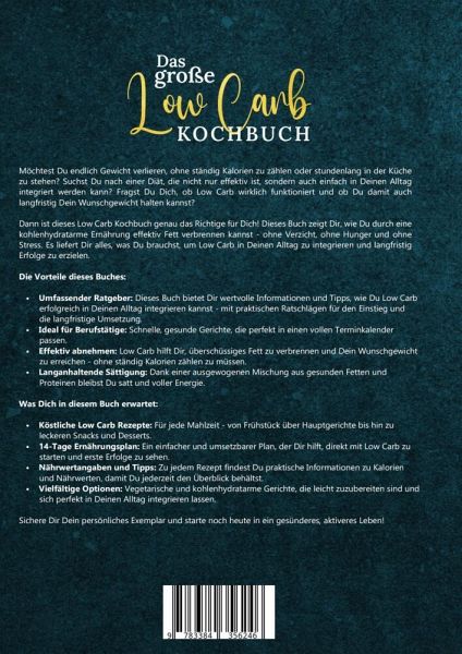 Möchtest Du endlich Gewicht verlieren, ohne ständig Kalorien zu zählen oder stundenlang in der Küche zu stehen? Suchst Du nach einer Diät, die nicht nur effektiv ist, sondern auch einfach in Deinen Alltag integriert werden kann? Fragst Du Dich, ob Low Carb wirklich funktioniert und ob Du damit auch langfristig Dein Wunschgewicht halten kannst?Dann ist dieses Low Carb Kochbuch genau das Richtige für Dich! Dieses Buch zeigt Dir, wie Du durch eine kohlenhydratarme Ernährung effektiv Fett verbrennen kannst - ohne Verzicht, ohne Hunger und ohne Stress. Es liefert Dir alles, was Du brauchst, um Low Carb in Deinen Alltag zu integrieren und langfristig Erfolge zu erzielen.Die Vorteile dieses Buches:- Umfassender Ratgeber: Dieses Buch bietet Dir wertvolle Informationen und Tipps, wie Du Low Carb erfolgreich in Deinen Alltag integrieren kannst - mit praktischen Ratschlägen für den Einstieg und die langfristige Umsetzung.- Ideal für Berufstätige: Schnelle, gesunde Gerichte, die perfekt in einen vollen Terminkalender passen.- Effektiv abnehmen: Low Carb hilft Dir, überschüssiges Fett zu verbrennen und Dein Wunschgewicht zu erreichen - ohne ständig Kalorien zählen zu müssen.- Langanhaltende Sättigung: Dank einer ausgewogenen Mischung aus gesunden Fetten und Proteinen bleibst Du satt und voller Energie.Was Dich in diesem Buch erwartet:- Köstliche Low Carb Rezepte: Für jede Mahlzeit - von Frühstück über Hauptgerichte bis hin zu leckeren Snacks und Desserts.- 14-Tage Ernährungsplan: Ein einfacher und umsetzbarer Plan, der Dir hilft, direkt mit Low Carb zu starten und erste Erfolge zu sehen.- Nährwertangaben und Tipps: Zu jedem Rezept findest Du praktische Informationen zu Kalorien und Nährwerten, damit Du jederzeit den Überblick behältst.- Vielfältige Optionen: Vegetarische und kohlenhydratarme Gerichte, die leicht zuzubereiten sind und sich perfekt in Deinen Alltag integrieren lassen.Sichere Dir jetzt Dein Exemplar und starte noch heute Deinen Weg zu einem gesünderen und glücklicheren Leben mit Low Carb!