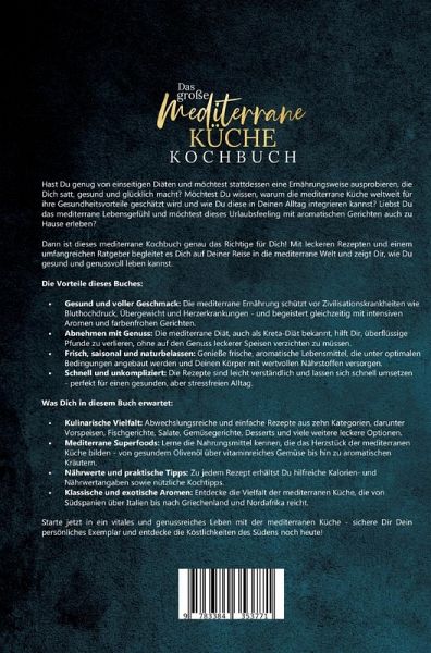 Hast Du genug von einseitigen Diäten und möchtest stattdessen eine Ernährungsweise ausprobieren, die Dich satt, gesund und glücklich macht? Möchtest Du wissen, warum die mediterrane Küche weltweit für ihre Gesundheitsvorteile geschätzt wird und wie Du diese in Deinen Alltag integrieren kannst? Liebst Du das mediterrane Lebensgefühl und möchtest dieses Urlaubsfeeling mit aromatischen Gerichten auch zu Hause erleben?Dann ist dieses mediterrane Kochbuch genau das Richtige für Dich! Mit leckeren Rezepten und einem umfangreichen Ratgeber begleitet es Dich auf Deiner Reise in die mediterrane Welt und zeigt Dir, wie Du gesund und genussvoll leben kannst.Die Vorteile dieses Buches:- Gesund und voller Geschmack: Die mediterrane Ernährung schützt vor Zivilisationskrankheiten wie Bluthochdruck, Übergewicht und Herzerkrankungen - und begeistert gleichzeitig mit intensiven Aromen und farbenfrohen Gerichten.- Abnehmen mit Genuss: Die mediterrane Diät, auch als Kreta-Diät bekannt, hilft Dir, überflüssige Pfunde zu verlieren, ohne auf den Genuss leckerer Speisen verzichten zu müssen.- Frisch, saisonal und naturbelassen: Genieße frische, aromatische Lebensmittel, die unter optimalen Bedingungen angebaut werden und Deinen Körper mit wertvollen Nährstoffen versorgen.- Schnell und unkompliziert: Die Rezepte sind leicht verständlich und lassen sich schnell umsetzen - perfekt für einen gesunden, aber stressfreien Alltag.Was Dich in diesem Buch erwartet:- Kulinarische Vielfalt: Abwechslungsreiche und einfache Rezepte aus zehn Kategorien, darunter Vorspeisen, Fischgerichte, Salate, Gemüsegerichte, Desserts und viele weitere leckere Optionen.- Mediterrane Superfoods: Lerne die Nahrungsmittel kennen, die das Herzstück der mediterranen Küche bilden - von gesundem Olivenöl über vitaminreiches Gemüse bis hin zu aromatischen Kräutern.- Nährwerte und praktische Tipps: Zu jedem Rezept erhältst Du hilfreiche Kalorien- und Nährwertangaben sowie nützliche Kochtipps.- Klassische und exotische Aromen: Entdecke die Vielfalt der mediterranen Küche, die von Südspanien über Italien bis nach Griechenland und Nordafrika reicht.Starte jetzt in ein vitales und genussreiches Leben mit der mediterranen Küche - sichere Dir Dein persönliches Exemplar und entdecke die Köstlichkeiten des Südens noch heute!