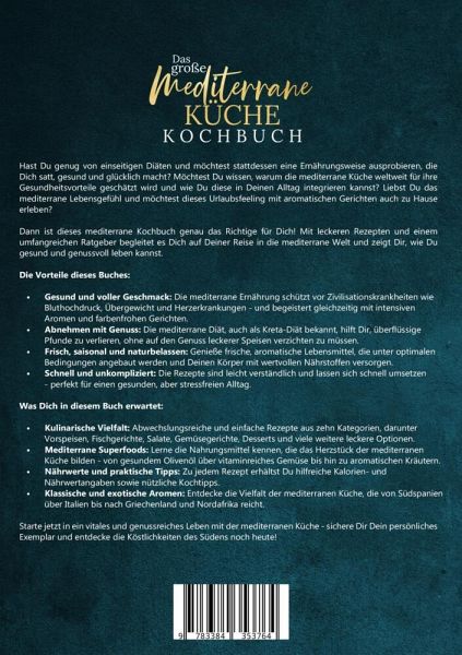 Hast Du genug von einseitigen Diäten und möchtest stattdessen eine Ernährungsweise ausprobieren, die Dich satt, gesund und glücklich macht? Möchtest Du wissen, warum die mediterrane Küche weltweit für ihre Gesundheitsvorteile geschätzt wird und wie Du diese in Deinen Alltag integrieren kannst? Liebst Du das mediterrane Lebensgefühl und möchtest dieses Urlaubsfeeling mit aromatischen Gerichten auch zu Hause erleben?Dann ist dieses mediterrane Kochbuch genau das Richtige für Dich! Mit leckeren Rezepten und einem umfangreichen Ratgeber begleitet es Dich auf Deiner Reise in die mediterrane Welt und zeigt Dir, wie Du gesund und genussvoll leben kannst.Die Vorteile dieses Buches:- Gesund und voller Geschmack: Die mediterrane Ernährung schützt vor Zivilisationskrankheiten wie Bluthochdruck, Übergewicht und Herzerkrankungen - und begeistert gleichzeitig mit intensiven Aromen und farbenfrohen Gerichten.- Abnehmen mit Genuss: Die mediterrane Diät, auch als Kreta-Diät bekannt, hilft Dir, überflüssige Pfunde zu verlieren, ohne auf den Genuss leckerer Speisen verzichten zu müssen.- Frisch, saisonal und naturbelassen: Genieße frische, aromatische Lebensmittel, die unter optimalen Bedingungen angebaut werden und Deinen Körper mit wertvollen Nährstoffen versorgen.- Schnell und unkompliziert: Die Rezepte sind leicht verständlich und lassen sich schnell umsetzen - perfekt für einen gesunden, aber stressfreien Alltag.Was Dich in diesem Buch erwartet:- Kulinarische Vielfalt: Abwechslungsreiche und einfache Rezepte aus zehn Kategorien, darunter Vorspeisen, Fischgerichte, Salate, Gemüsegerichte, Desserts und viele weitere leckere Optionen.- Mediterrane Superfoods: Lerne die Nahrungsmittel kennen, die das Herzstück der mediterranen Küche bilden - von gesundem Olivenöl über vitaminreiches Gemüse bis hin zu aromatischen Kräutern.- Nährwerte und praktische Tipps: Zu jedem Rezept erhältst Du hilfreiche Kalorien- und Nährwertangaben sowie nützliche Kochtipps.- Klassische und exotische Aromen: Entdecke die Vielfalt der mediterranen Küche, die von Südspanien über Italien bis nach Griechenland und Nordafrika reicht.Starte jetzt in ein vitales und genussreiches Leben mit der mediterranen Küche - sichere Dir Dein persönliches Exemplar und entdecke die Köstlichkeiten des Südens noch heute!