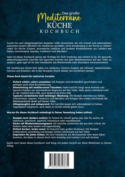 Suchst Du nach alltagstauglichen Rezepten voller Geschmack, die sich schnell und unkompliziert zubereiten lassen? Möchtest Du mediterran genießen, ohne stundenlang in der Küche zu stehen? Liebst Du frische Zutaten, aromatische Gewürze und kreative Kombinationen aus Ländern wie Italien, Griechenland, Spanien, Frankreich und Marokko?Dann ist dieses Kochbuch genau das Richtige für Dich! Entdecke, wie einfach es ist, Dir gesunde, abwechslungsreiche Gerichte mit typischen Aromen aus dem Mittelmeerraum auf den Teller zu zaubern, ganz egal ob für den Feierabend, das Wochenende oder besondere Genussmomente.Die mediterrane Küche lebt dabei von einfachen, frischen Zutaten wie Olivenöl, Hülsenfrüchten, Gemüse und Kräutern, die in den Rezepten immer wieder neu kombiniert werden.Dieses Buch bietet Dir zahlreiche Vorteile:- Einfach erklärt, sofort umsetzbar: Die Rezepte sind verständlich geschrieben und gelingen auch ohne Kocherfahrung.- Abwechslung mit mediterranem Charakter: Jedes Gericht bringt neue Aromen und typische Zutaten aus verschiedenen Regionen auf den Teller. Viele davon orientieren sich an der mediterranen Diät, auch bekannt als Kreta-Diät.- Typische Länderküche statt beliebiger Mischung: Die Rezepte stammen aus Italien, Griechenland, Spanien, Frankreich und Marokko und bringen den echten Geschmack der Mittelmeerküche direkt auf Deinen Teller.- Alltagstauglich und zeitsparend: Die Gerichte lassen sich unkompliziert in Deinen Tagesablauf integrieren, auch wenn es einmal schnell gehen muss.Warum Du dieses Kochbuch unbedingt in Deiner Sammlung haben solltest:- Rezepte nach Ländern sortiert: So findest Du schnell genau das, was Du suchst, ob italienisch, griechisch, spanisch, französisch oder marokkanisch.- Küche mit Wiedererkennungswert: Die Gerichte schmecken wie aus dem Urlaub. Sie bleiben dabei aber kreativ und eigenständig.- Einfach kochen, lecker essen: Du brauchst kein großes Vorwissen. Die Rezepte funktionieren zuverlässig und bringen echten Geschmackauf den Teller.- Inspiration für jeden Anlass: Ob zum Feierabend, am Wochenende oder wenn Gäste kommen, die Ideen in diesem Buch sind vielseitig und machen Lust aufs Kochen.Kaufe noch heute dieses Kochbuch und bring mit jedem Gericht ein Stück Mittelmeer in Deinen Alltag.