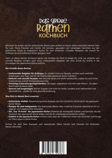 Möchtest Du lernen, wie Du authentische Ramen ganz einfach zu Hause selbst zubereiten kannst? Hast Du Lust, Deine Freunde und Familie mit leckeren, gesunden und vielseitigen Gerichten aus der japanischen Küche zu begeistern? Suchst Du nach einfachen, schnellen Rezepten, die sowohl für Anfänger als auch erfahrene Köche geeignet sind?Dann ist dieses Ramen Kochbuch genau das Richtige für Dich! Es bietet Dir nicht nur einfache und schnelle Rezepte, sondern auch einen umfassenden Ratgeber, der Dich Schritt für Schritt in die Grundlagen der japanischen Küche einführt.Die Vorteile dieses Buches:-…mehr