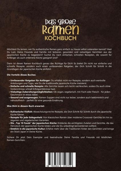 Möchtest Du lernen, wie Du authentische Ramen ganz einfach zu Hause selbst zubereiten kannst? Hast Du Lust, Deine Freunde und Familie mit leckeren, gesunden und vielseitigen Gerichten aus der japanischen Küche zu begeistern? Suchst Du nach einfachen, schnellen Rezepten, die sowohl für Anfänger als auch erfahrene Köche geeignet sind?Dann ist dieses Ramen Kochbuch genau das Richtige für Dich! Es bietet Dir nicht nur einfache und schnelle Rezepte, sondern auch einen umfassenden Ratgeber, der Dich Schritt für Schritt in die Grundlagen der japanischen Küche einführt.Die Vorteile dieses Buches:- Umfassender Ratgeber für Anfänger: Du erhältst nicht nur Rezepte, sondern auch wertvolle Anleitungen und Tipps, wie Du die traditionelle japanische Küche meisterst.- Einfache und schnelle Rezepte: Alle Gerichte lassen sich leicht nachkochen, sodass Du auch ohne Vorkenntnisse schnell Erfolgserlebnisse hast.- Vielseitige Zubereitungsmöglichkeiten: Ob vegan, vegetarisch, mit Fisch oder Fleisch - für jeden Geschmack ist etwas dabei.- Gesund und ausgewogen: Ramen-Suppen sind nicht nur lecker, sondern auch bekömmlich und nährstoffreich - perfekt für eine gesunde Ernährung.Was Dich in diesem Buch erwartet:- Kulinarische Vielfalt: Abwechslungsreiche Rezepte, die Dich Schritt für Schritt durch die japanische Küche führen.- Rezepte für jede Gelegenheit: Von klassischen Ramen über moderne Crossover-Gerichte bis hin zu veganen und vegetarischen Varianten.- Die "Top 10 Foods" der japanischen Küche: Entdecke die wichtigsten Zutaten und Gerichte, die das Herzstück der japanischen Küche bilden und die Du unbedingt kennenlernen solltest.- Einblick in die japanische Kultur: Erfahre mehr über die Traditionen hinter den Gerichten und bringe ein Stück Japan in Deine Küche.Sichere Dir jetzt Dein Exemplar und beeindrucke Deine Familie und Freunde mit köstlichen Ramen-Gerichten.