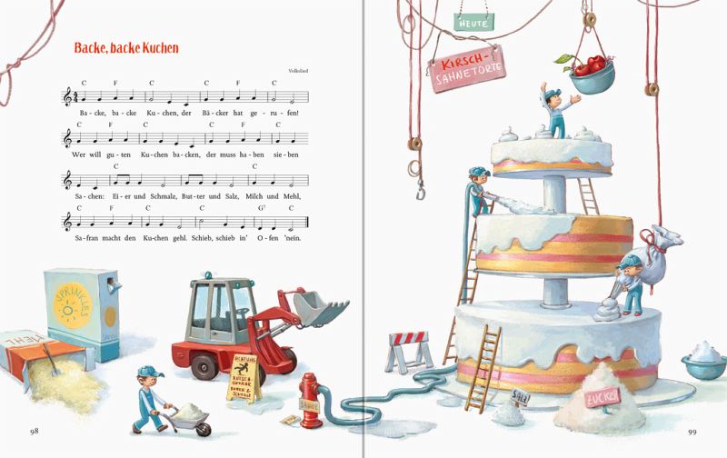 "Das große Ravensburger Liederbuch" enthält die 90 beliebtesten und bekanntesten deutschen und fremdsprachigen Kinderlieder aus folgenden Themenbereichen: Lieder von den Jahreszeiten und vom Geburtstagfeiern, Lieder von großen und kleinen Tieren, Lieder aus aller Welt, Lieder vom Reisen und Unterwegssein, Lustige Lieder zum Spielen, Tanzen und Fröhlichsein, Märchenhafte Lieder von Prinzessinnen, Hexen und Fabelwesen, Zauberhafte Lieder zum Schlummern und Träumen, Lieder für die Advents- und Weihnachtszeit. Alle Lieder sind mit vollständigem Text, Notensatz und Gitarrenakkorden abgebildet. Die fantasievoellen, witzige Illustrationen von Cornelia Haas verleihen älteren Liedern aus dem Volksgut einen modernen Anstrich. Die umfangreiche Liedauswahl und die vielen liebevollen Illustrationen machen dieses Hausbuch zu einem langjährigen Begleiter für die ganze Familie.