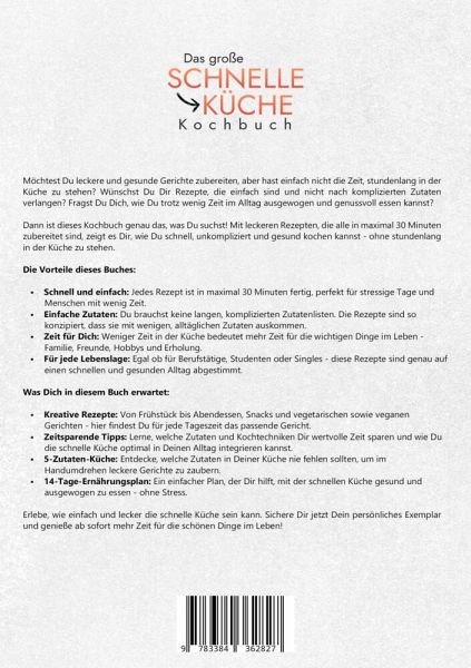 Möchtest Du leckere und gesunde Gerichte zubereiten, aber hast einfach nicht die Zeit, stundenlang in der Küche zu stehen? Wünschst Du Dir Rezepte, die einfach sind und nicht nach komplizierten Zutaten verlangen? Fragst Du Dich, wie Du trotz wenig Zeit im Alltag ausgewogen und genussvoll essen kannst?Dann ist dieses Kochbuch genau das, was Du suchst! Mit leckeren Rezepten, die alle in maximal 30 Minuten zubereitet sind, zeigt es Dir, wie Du schnell, unkompliziert und gesund kochen kannst - ohne stundenlang in der Küche zu stehen.Die Vorteile dieses Buches:- Schnell und einfach: Jedes Rezept ist in maximal 30 Minuten fertig, perfekt für stressige Tage und Menschen mit wenig Zeit.- Einfache Zutaten: Du brauchst keine langen, komplizierten Zutatenlisten. Die Rezepte sind so konzipiert, dass sie mit wenigen, alltäglichen Zutaten auskommen.- Zeit für Dich: Weniger Zeit in der Küche bedeutet mehr Zeit für die wichtigen Dinge im Leben - Familie, Freunde, Hobbys und Erholung.- Für jede Lebenslage: Egal ob für Berufstätige, Studenten oder Singles - diese Rezepte sind genau auf einen schnellen und gesunden Alltag abgestimmt.Was Dich in diesem Buch erwartet:- Kreative Rezepte: Von Frühstück bis Abendessen, Snacks und vegetarischen sowie veganen Gerichten - hier findest Du für jede Tageszeit das passende Gericht.- Zeitsparende Tipps: Lerne, welche Zutaten und Kochtechniken Dir wertvolle Zeit sparen und wie Du die schnelle Küche optimal in Deinen Alltag integrieren kannst.- 5-Zutaten-Küche: Entdecke, welche Zutaten in Deiner Küche nie fehlen sollten, um im Handumdrehen leckere Gerichte zu zaubern.- 14-Tage-Ernährungsplan: Ein einfacher Plan, der Dir hilft, mit der schnellen Küche gesund und ausgewogen zu essen - ohne Stress.Erlebe, wie einfach und lecker die schnelle Küche sein kann. Sichere Dir jetzt Dein persönliches Exemplar und genieße ab sofort mehr Zeit für die schönen Dinge im Leben!