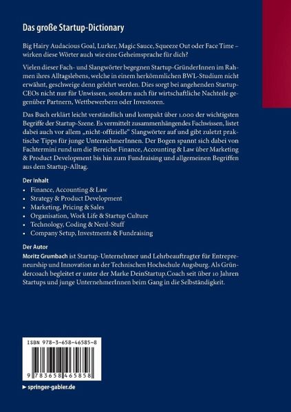 Das Buch erklärt leicht verständlich und kompakt über 1.000 der wichtigsten Begriffe der Startup-Szene. Es vermittelt zusammenhängendes Fachwissen, listet dabei auch vor allem nicht-offizielle Slangwörter auf und gibt zuletzt praktische Tipps für junge UnternehmerInnen. Der Bogen spannt sich dabei von Fachtermini rund um die Bereiche Finance, Accounting & Law über Marketing & Product Development bis hin zum Fundraising und allgemeinen Begriffen aus dem Startup-Alltag.
