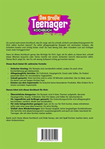Du suchst nach einem Kochbuch, das Dir zeigt, wie Du schnell, einfach und abwechslungsreich für Dich selbst kochen kannst? Du willst alltagstaugliche Rezepte mit vertrauten Zutaten, die trotzdem kreativ und richtig lecker sind? Du hast wenig Zeit, aber trotzdem Lust auf richtiges Essen statt Fertiggerichte?Dann ist dieses Kochbuch genau das Richtige für Dich. Egal, ob Du allein zu Hause bist, schnell etwas Warmes brauchst oder Deine Familie mit einem einfachen Gericht überraschen willst. Dieses Buch zeigt Dir, wie Du mit wenig Aufwand richtig gut kochen kannst.Dieses Buch bietet Dir zahlreiche Vorteile:- Einfacher Einstieg: Die Rezepte sind verständlich erklärt, sodass Du auch ohne Kocherfahrung gut klarkommst.- Alltagstaugliche Gerichte: Ob Frühstück, Hauptgericht, Snack oder Süßes, Du findest passende Ideen für verschiedene Tageszeiten.- Schnell gemacht: Viele Gerichte sind in unter 30 Minuten zubereitet. Das ist ideal, wenn Du keine Lust auf langes Kochen hast.- Zutaten aus dem Supermarkt: Du brauchst keine besonderen Produkte. Alles findest Du in einem normalen Supermarkt.Darum lohnt sich dieses Kochbuch für Dich:- Übersichtliche Kategorien: Die Rezepte sind in klare Themen aufgeteilt, darunter Hauptgerichte, Snacks, Frühstück, One-Pot-Ideen und Süßes für zwischendurch.- Für Jugendliche und Anfänger gemacht: Die Zubereitungsschritte sind alltagstauglich beschrieben, sachlich, direkt und verständlich.- Für viele Gelegenheiten geeignet: Egal, ob Du nur für Dich kochst, etwas mitnehmen willst oder eine neue Idee brauchst. Du wirst fündig.- Vielfalt ohne Wiederholungen: Kein Rezept doppelt, keine langweiligen Kombinationen. Die Gerichte sind abwechslungsreich zusammengestellt und auch ein tolles Geschenk für Teenager, die mit dem Kochen starten wollen.Kaufe noch heute dieses Kochbuch und finde heraus, wie viel Spaß Kochen machen kann, auch ohne Vorkenntnisse.