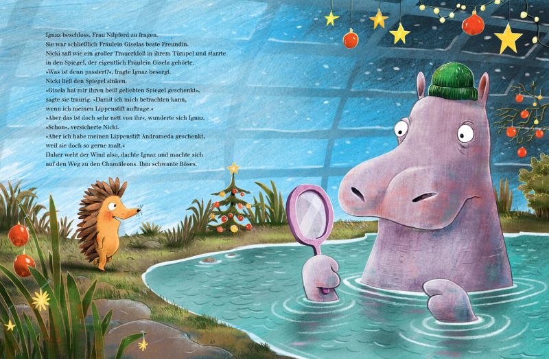 Uns gefällt die Botschaft hinter dieser Geschichte sehr. Außerdem ist der Aufbau recht gut gemacht. Seite für Seite wandert man von Tier zu Tier und verfolgt, wie jedes ohne seinen liebsten Gegenstand ziemlich traurig wirkt. Die Stimmung wird von Illustrator Günther Jakob, dessen Bilder wir ohnehin gern mögen, sehr gut in Szene gesetzt. Zwar ist der Zoo weihnachtlich geschmückt. Die Mimik der Tiere zeigt aber deutlich, dass die Stimmung im Keller ist, bis alle zu Igel Ignaz' Feier zusammenkommen. Ein paar Details haben uns besonders gefallen, z.B. dass Gisela Giraffe wegen ihres langen Halses zwei Seiten einnimmt anstatt nur eine und man das Buch dann drehen muss. Das pass einfach super. Auch Igel Ignaz und Zoodirektor Ungestüm in ihren Kostümen für die Bescherung haben uns zum Lachen gebracht. Das Highlight bildet die letzte Doppelseite, auf der es so viel zu entdecken gibt und die auch bei uns jetzt schon Weihnachtstimmung hervorruft.