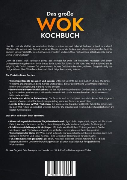 Hast Du Lust, die Vielfalt der asiatischen Küche zu entdecken und dabei einfach und schnell zu kochen? Möchtest Du wissen, wie Du mit nur einer Pfanne gesunde, leckere und abwechslungsreiche Gerichte zaubern kannst? Willst Du Dein Kochwissen erweitern und zum Wok-Profi werden, selbst wenn Du bisher wenig Erfahrung hast?Dann ist dieses Wok Kochbuch genau das Richtige für Dich! Mit köstlichen Rezepten und einem umfassenden Ratgeber führt Dich dieses Buch Schritt für Schritt in die Kunst des Wok-Kochens ein. Es zeigt Dir, wie Du in kürzester Zeit gesunde und leckere Gerichte zubereitest, während Du gleichzeitig das nötige Wissen über Wok-Techniken und die richtige Ausstattung erlernst.Die Vorteile dieses Buches:- Vielseitige Rezepte aus Asien und Europa: Entdecke Gerichte aus den Küchen Chinas, Thailands, Vietnams, Indonesiens, Indiens, Koreas und Europas, die Dir authentische Geschmackserlebnisse bieten und Abwechslung in Deine Küche bringen.- Gesund und nährstoffreich kochen: Mit der Wok-Methode bereitest Du Gerichte zu, die nicht nur gut schmecken, sondern auch nährstoffschonend sind, da die kurzen Garzeiten die Vitamine und Nährstoffe erhalten.- Schnelle und einfache Zubereitung: Die Rezepte sind so konzipiert, dass sie in kurzer Zeit umgesetzt werden können - ideal für den stressigen Alltag, ohne auf Genuss zu verzichten.- Leichte Einführung in Wok-Techniken: Der umfassende Ratgeber erklärt Dir Schritt für Schritt, wie Du den Wok richtig verwendest, welches Zubehör Du brauchst und welche Zubereitungstechniken am besten funktionieren.Was Dich in diesem Buch erwartet:- Abwechslungsreiche Rezepte für jeden Geschmack: Egal ob Du vegetarisch, vegan, mit Fisch oder Fleisch kochen möchtest - das Buch bietet Rezepte für jede Vorliebe und jeden Ernährungsstil.- Schrittweise Anleitungen für Anfänger: Mit leicht verständlichen Erklärungen lernst Du die wichtigsten Wok-Techniken und wirst von einfachen zu komplexeren Gerichten geführt.- Vielseitigkeit des Woks: DerWok eignet sich nicht nur zum schnellen Anbraten, sondern auch zum Dämpfen, Frittieren und sogar Kochen - eine vielseitige Bereicherung für jede Küche.- Für jeden Kochlevel geeignet: Egal, ob Du Anfänger bist oder schon Erfahrung hast - dieses Rezeptbuch liefert Dir sowohl Grundlagenwissen als auch Inspiration für fortgeschrittene Wok-Gerichte.Sichere Dir jetzt Dein Exemplar und werde zum Wok-Profi in Deiner eigenen Küche!