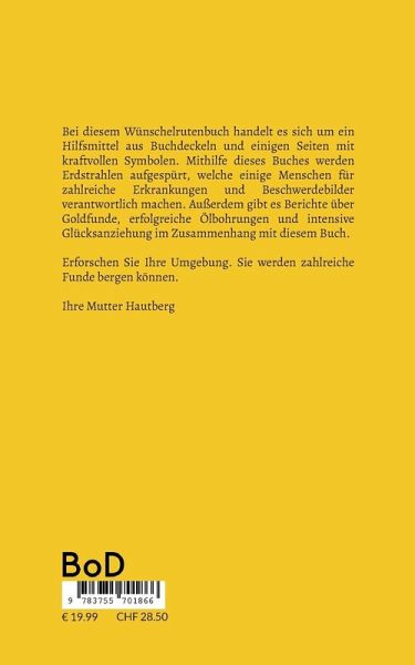 Bei diesem Wünschelrutenbuch handelt es sich um ein Hilfsmittel aus Buchdeckeln und einigen Seiten mit kraftvollen Symbolen. Mithilfe dieses Buches werden Erdstrahlen aufgespürt, welche einige Menschen für zahlreiche Erkrankungen und Beschwerdebilder verantwortlich machen. Außerdem gibt es Berichte über Goldfunde, erfolgreiche Ölbohrungen und intensive Glücksanziehung im Zusammenhang mit diesem Buch.Erforschen Sie Ihre Umgebung. Sie werden zahlreiche Funde bergen können. Ihre Mutter Hautberg