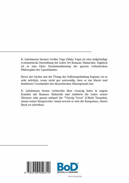 K. Lakshmana Sarmas Großes Yoga (Maha Yoga) ist eine tiefgründige systematische Darstellung der Lehre Sri Ramana Maharshis. Zugleich ist es eine klare Zusammenfassung der ganzen vedantischen Philosophie der Upanishaden.Bevor der Sucher mit der Übung der Selbstergründung beginnt, ist es sehr nützlich, wenn nicht gar notwendig, dass er ein klares und fundiertes Verständnis des theoretischen Hintergrunds hat.K. Lakshmana Sarma verbrachte über zwanzig Jahre in engem Kontakt mit Ramana Maharshi und studierte die Lehre seines Meisters sehr genau anhand der "Vierzig Verse" (Ulladu Narpadu), einem seiner Hauptwerke. Somit erwarb er sich die Kompetenz, dieses Buch zu schreiben.