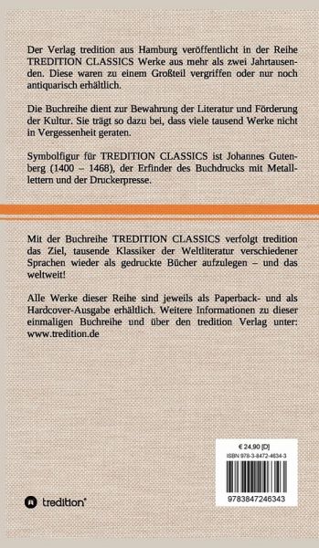 Diese Hardcover-Ausgabe ist Teil der TREDITION CLASSICS. Der Verlag tredition aus Hamburg veröffentlicht in der Buchreihe TREDITION CLASSICS Werke aus mehr als zwei Jahrtausenden. Diese waren zu einem Großteil vergriffen oder nur noch antiquarisch erhältlich. Mit TREDITION CLASSICS verfolgt tredition das Ziel, tausende Klassiker der Weltliteratur verschiedener Sprachen wieder als gedruckte Bücher zu verlegen und das weltweit! Die Buchreihe dient zur Bewahrung der Literatur und Förderung der Kultur. Sie trägt so dazu bei, dass viele tausend Werke nicht in Vergessenheit geraten.