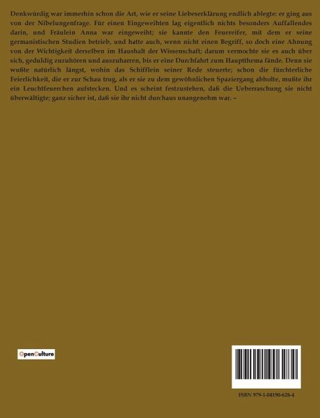 Denkwürdig war immerhin schon die Art, wie er seine Liebeserklärung endlich ablegte: er ging aus von der Nibelungenfrage. Für einen Eingeweihten lag eigentlich nichts besonders Auffallendes darin, und Fräulein Anna war eingeweiht; sie kannte den Feuereifer, mit dem er seine germanistischen Studien betrieb, und hatte auch, wenn nicht einen Begriff, so doch eine Ahnung von der Wichtigkeit derselben im Haushalt der Wissenschaft; darum vermochte sie es auch über sich, geduldig zuzuhören und auszuharren, bis er eine Durchfahrt zum Hauptthema fände. Denn sie wußte natürlich längst, wohin das Schifflein seiner Rede steuerte; schon die fürchterliche Feierlichkeit, die er zur Schau trug, als er sie zu dem gewöhnlichen Spaziergang abholte, mußte ihr ein Leuchtfeuerchen aufstecken. Und es scheint festzustehen, daß die Ueberraschung sie nicht überwältigte; ganz sicher ist, daß sie ihr nicht durchaus unangenehm war. ¿