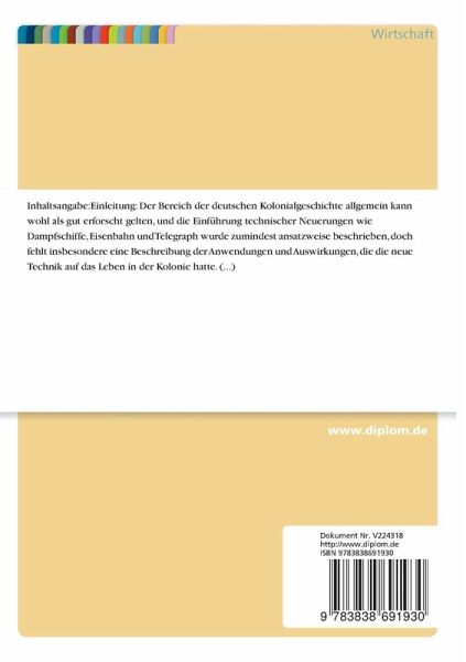 Der Bereich der deutschen Kolonialgeschichte allgemein kann wohl als gut erforscht gelten, und die Einführung technischer Neuerungen wie Dampfschiffe, Eisenbahn und Telegraph wurde zumindest ansatzweise beschrieben, doch fehlt insbesondere eine Beschreibung der Anwendungen und Auswirkungen, die die neue Technik auf das Leben in der Kolonie hatte. Ohne die Kenntnis solcher Folgewirkungen bleiben jedoch Rückschlüsse auf die Effektivität der Technik und damit auch ihr Einfluss auf die Kolonialpolitik reine Mutmaßung es ist unmöglich, solche Auswirkungen von reinem Wunschdenken bzw. Kolonialpropaganda und apologetik zu trennen (z.B. die Kolonie als Absatzmarkt der Industrie des Mutterlandes ).