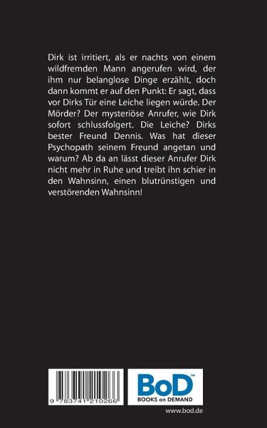Dirk ist irritiert, als er nachts von einem wildfremden Mann angerufen wird, der ihm nur belanglose Dinge erzählt, doch dann kommt er auf den Punkt: Er sagt, dass vor Dirks Tür eine Leiche liegen würde. Der Mörder? Der mysteriöse Anrufer, wie Dirk sofort schlussfolgert. Die Leiche? Dirks bester Freund Dennis. Was hat dieser Psychopath seinem Freund angetan und warum? Ab da an lässt dieser Anrufer Dirk nicht mehr in Ruhe und treibt ihn schier in den Wahnsinn, einen blutrünstigen und verstörenden Wahnsinn!Eine moderne Dr. Jekyll und Mr. Hyde Version.Spannend und mit viel Tempo wird die Geschichte eines Verlorenen in einer ihn überfordernden, gleichgültigen Umwelt erzählt. Bereits durch die, dem Protagonisten Dirk in den Mund gelegte, Wortwahl wird seine innere Zerrissenheit und der Wandel seiner Persönlichkeit ersichtlich. Der - zu spät geführte - Kampf um ein selbst bestimmtes Leben ohne Rücksicht auf Konventionen bringt den Hauptdarsteller in extreme Situationen und über den Randdes Wahnsinns hinaus.