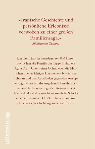 Ein altes Haus in Senedjan. Seit 800 Jahren wohnt hier die Familie des Teppichhändlers Agha Djan. Unter seiner Obhut leben die Menschen in einträchtiger Harmonie - bis die von Teheran und den Aufständen gegen das korrupte Regime des Schahs ausgehende Unruhe auch sie erreicht. In seinem neuen Roman breitet Kader Abdolah das zutiefst menschliche Schicksal einer iranischen Großfamilie wie ein bunt schillerndes Geschichtengewebe vor uns aus.