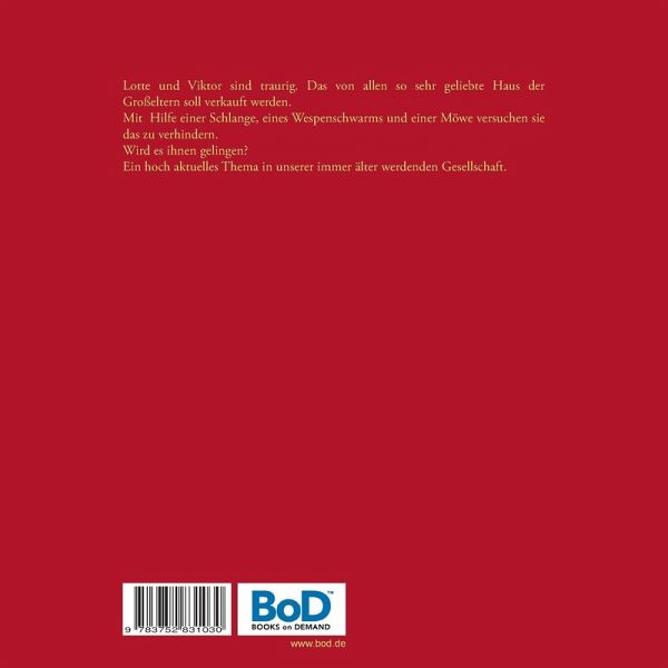 Lotte und Viktor sind traurig. Das von allen so sehr geliebte Haus der Großeltern soll verkauft werden.Mit Hilfe einer Schlange, eines Wespenschwarms und einer Möwe versuchen sie das zu verhindern.Wird es ihnen gelingen?Ein hoch aktuelles Thema in unserer immer älter werdenden Gesellschaft.
