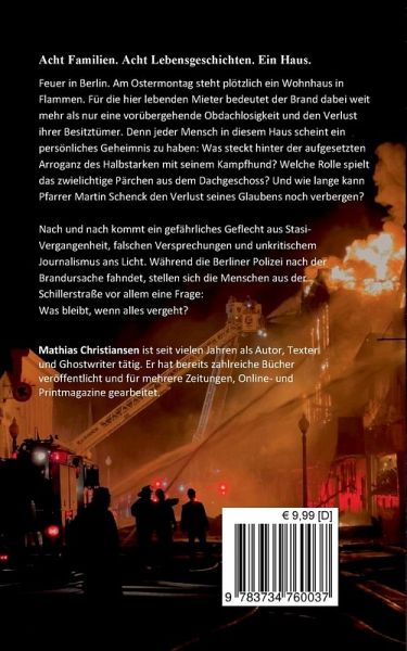 Feuer in Berlin. Am Ostermontag steht plötzlich ein Wohnhaus in Flammen. Für die hier lebenden Mieter bedeutet der Brand dabei weit mehr als nur eine vorübergehende Obdachlosigkeit und den Verlust ihrer Besitztümer. Denn jeder Mensch in diesem Haus scheint ein persönliches Geheimnis zu haben: Was steckt hinter der aufgesetzten Arroganz des Halbstarken mit seinem Kampfhund? Welche Rolle spielt das zwielichtige Pärchen aus dem Dachgeschoss? Und wie lange kann Pfarrer Martin Schenck den Verlust seines Glaubens noch verbergen? Nach und nach kommt ein gefährliches Geflecht aus Stasi-Vergangenheit, falschen Versprechungen und unkritischem Journalismus ans Licht. Während die Berliner Polizei nach der Brandursache fahndet, stellen sich die Menschen aus der Schillerstraße vor allem eine Frage: Was bleibt, wenn alles vergeht?"Das Haus der Heimlichkeiten" präsentiert sich als anregender Roman für Frauen und spannender Krimi für Männer gleichermaßen. Durch eine geschickte Verknüpfung verschiedener Begegnungspunkte und dem Blick aus unterschiedlichen Perspektiven begleitet der Leser die einzelnen Mieter wie auf einer kleinen Zeitreise durch ihr Leben und durch den Tag des Brandes. Erzählt werden Geschichten, die echten Tiefgang haben und Menschen im Spannungsfeld zwischen großen Gefühlen, persönlichen Ängsten und der Suche nach Wahrheit zeigen.