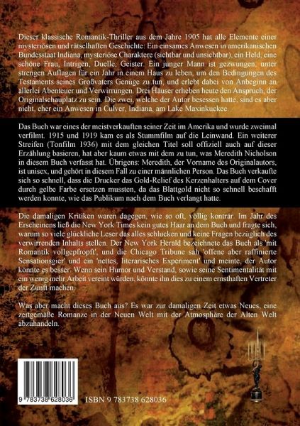 Dieser klassische Romantik-Thriller aus dem Jahre 1905 hat alle Elemente einer mysteriösen und rätselhaften Geschichte: Ein einsames Anwesen in amerikanischen Bundesstaat Indiana, mysteriöse Charaktere (sichtbar und unsichtbar), ein Held, eine schöne Frau, Intrigen, Duelle, Geister. Ein junger Mann ist gezwungen, unter strengen Auflagen für ein Jahr in einem Haus zu leben, um den Bedingungen des Testaments seines Großvaters Genüge zu tun, und erlebt dabei von Anbeginn an allerlei Abenteuer und Verwirrungen. Drei Häuser erheben heute den Anspruch, der Originalschauplatz zu sein. Die zwei, welche der Autor besessen hatte, sind es aber nicht, eher ein Anwesen in Culver, Indiana, am Lake Maxinkuckee.Das Buch war eines der meistverkauften seiner Zeit im Amerika und wurde zweimal verfilmt. 1915 und 1919 kam es als Stummfilm auf die Leinwand. Ein weiterer Streifen (Tonfilm 1936) mit dem gleichen Titel soll offiziell auch auf dieser Erzählung basieren, hat aber kaum etwas mit dem zu tun,was Meredith Nicholson in diesem Buch verfasst hat. Übrigens: Meredith, der Vorname des Originalautors, ist unisex, und gehört in diesem Fall zu einer männlichen Person. Das Buch verkaufte sich so schnell, dass die Drucker das Gold-Relief des Kerzenhalters auf dem Cover durch gelbe Farbe ersetzen mussten, da das Blattgold nicht so schnell beschafft werden konnte, wie das Publikum nach dem Buch verlangt hatte. Die damaligen Kritiken waren dagegen, wie so oft, völlig konträr. Im Jahr des Erscheinens ließ die New York Times kein gutes Haar an dem Buch und fragte sich, warum so viele glückliche Leser das alles schlucken und keine Fragen bezüglich des verwirrenden Inhalts stellen. Der New York Herald bezeichnete das Buch als 'mit Romantik vollgepfropft', und die Chicago Tribune sah 'offene aber raffinierte Sensationsgier' und ein 'nettes, literarisches Experiment' und meinte, der Autor könnte es besser. Wenn sein Humor und Verstand, sowie seine Sentimentalität mit ein wenig mehr Arbeit vereint würden, könnte ihn dies zu einem ernsthaften Vertreter der Zunft machen.Was aber macht dieses Buch aus? Es war zur damaligen Zeit etwas Neues, eine zeitgemäße Romanze in der Neuen Welt mit der Atmosphäre der Alten Welt abzuhandeln.