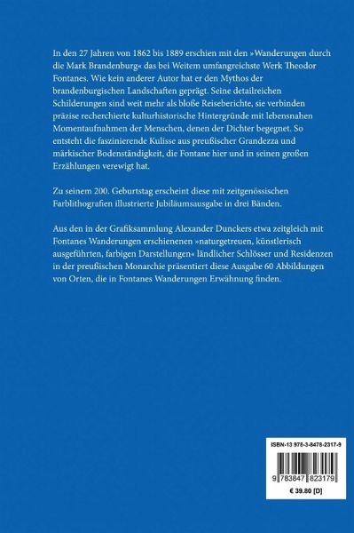 Theodor Fontane: Das Havelland und das Spreeland. Wanderungen durch die Mark Brandenburg Vollständige, farbig illustrierte Ausgabe In den 27 Jahren von 1862 bis 1889 erschien mit den »Wanderungen durch die Mark Brandenburg« das bei Weitem umfangreichste Werk Theodor Fontanes. Wie kein anderer Autor hat er den Mythos der brandenburgischen Landschaften geprägt. Seine detailreichen Schilderungen sind weit mehr als bloße Reiseberichte, sie verbinden präzise recherchierte kulturhistorische Hintergründe mit lebensnahen Momentaufnahmen der Menschen, denen der Dichter begegnet. So entsteht die faszinierende Kulisse aus preußischer Grandezza und märkischer Bodenständigkeit, die Fontane hier und in seinen großen Erzählungen verewigt hat. Zu seinem 200. Geburtstag erscheint diese mit zeitgenössischen Farblithografien illustrierte Jubiläumsausgabe in drei Bänden. Aus den in der Grafiksammlung Alexander Dunckers etwa zeitgleich mit Fontanes Wanderungen erschienenen »naturgetreuen, künstlerisch ausgeführten, farbigen Darstellungen« ländlicher Schlösser und Residenzen in der preußischen Monarchie präsentiert diese Ausgabe 60 Abbildungen von Orten, die in Fontanes Wanderungen Erwähnung finden. Großformat, 178 x 254 mm Berliner Ausgabe, 2019 Durchgesehener Neusatz bearbeitet und eingerichtet von Theodor Borken Havelland: Entstanden zwischen 1863 und 1872. Erstdruck: Berlin (W. Hertz) 1873. Der Text folgt der »Wohlfeilen Ausgabe« von 1892. Spreeland: Entstanden zwischen 1859 und 1881. Erstdruck: Berlin (W. Hertz) 1882. Der Text folgt der »Wohlfeilen Ausgabe« von 1892. Neuausgabe. Großformat, 178 x 254 mm Herausgegeben von Theodor Borken. Berlin 2019. Textgrundlage sind die Ausgaben: Theodor Fontane: Sämtliche Werke. Herausgegeben von Edgar Groß, Kurt Schreinert, Rainer Bachmann, Charlotte Jolles, Jutta Neuendorff-Fürstenau, Bd. 1¿25, Band 11, München: Nymphenburger Verlagshandlung, 1959¿1975. Theodor Fontane: Sämtliche Werke. Herausgegeben von Edgar Groß, Kurt Schreinert, Rainer Bachmann, Charlotte Jolles, Jutta Neuendorff-Fürstenau, Bd. 1¿25, Band 12, München: Nymphenburger Verlagshandlung, 1959¿1975. Die Paginierung obiger Ausgaben wird in dieser Neuausgabe als Marginalie zeilengenau mitgeführt. Umschlaggestaltung von Thomas Schultz-Overhage. Gesetzt aus der Minion Pro, 11 pt. Henricus Edition Deutsche Klassik UG (haftungsbeschränkt)