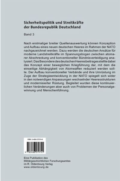 Die Autoren werten erstmals breit die Quellen aus und können daraufhin Konzeption und Aufbau eines neuen deutschen Heeres im Rahmen der NATO nachzeichnen. Sie analysieren die deutschen Ansätze für moderne Landstreitkräfte im Spannungsbogen zwischen atomarer Abschreckung und konventioneller Bündnisverteidigung. Das Besondere des deutschen Heeresbeitrags stellt das Konzept einer beweglichen Kriegführung dar, mit dem die einseitige Abhängigkeit von Atomwaffen reduziert werden soll. Der Aufbau konventioneller Verbände und ihre Umrüstung im Zuge der Strategieentwicklung in der NATO spiegelt sich wider in den notwendigen Anpassungen wechselnder Heeresstrukturen und modernisierter Rüstung.